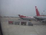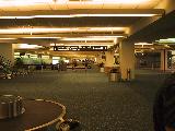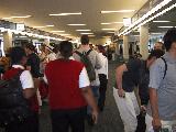 この写真は、同行の稲葉君が撮ったものです (ファイル名が ina_ で始まるもの、オリジナルは 1600x1200 だけど、 重すぎるよね、1/10 に縮小。稲葉君に感謝。ちなみに ken_ で始まるものは 私が撮ったものです、オリジナルは 1024x768、1/8 に縮小)。 まずは飛行機から降りて入国審査に向かうところ。「U」のすぐ左にいる 彼が稲葉君です。乗り換えに2時間余裕があったので、しばらく時間潰しです。 次の写真は空港内の様子に、搭乗口。う〜ん、これが外国 ;-p 。 さて、もう一頑張り、オーランドへ向けてのフライトです。 今度は南へ向かうだけなので時差は無しでした。 飛行機は、ノースウエストです。機内から向うに見える、 グレーに赤の機体でした。