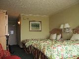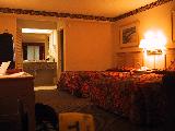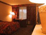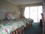 オーランド国際空港到着! カバンを受け取って、でっかいタクシーでホテルへ直行、 Sheraton World Resort です。 にしても、景色が横に長いなぁ・・・。 それに、眠い。空はまだ明るいってのにねぇ。 ホテルへ到着、チェックインの後、まずは各部屋で 一息ついて、みんなで夕食と言うことになりました。 部屋へ案内してもらって荷物を運んでもらい、 チップを渡す。う〜ん、初体験…。 入ってびっくり、広い部屋。私一人なんだけど…。 4人くらいでも十分泊れるなぁ…。